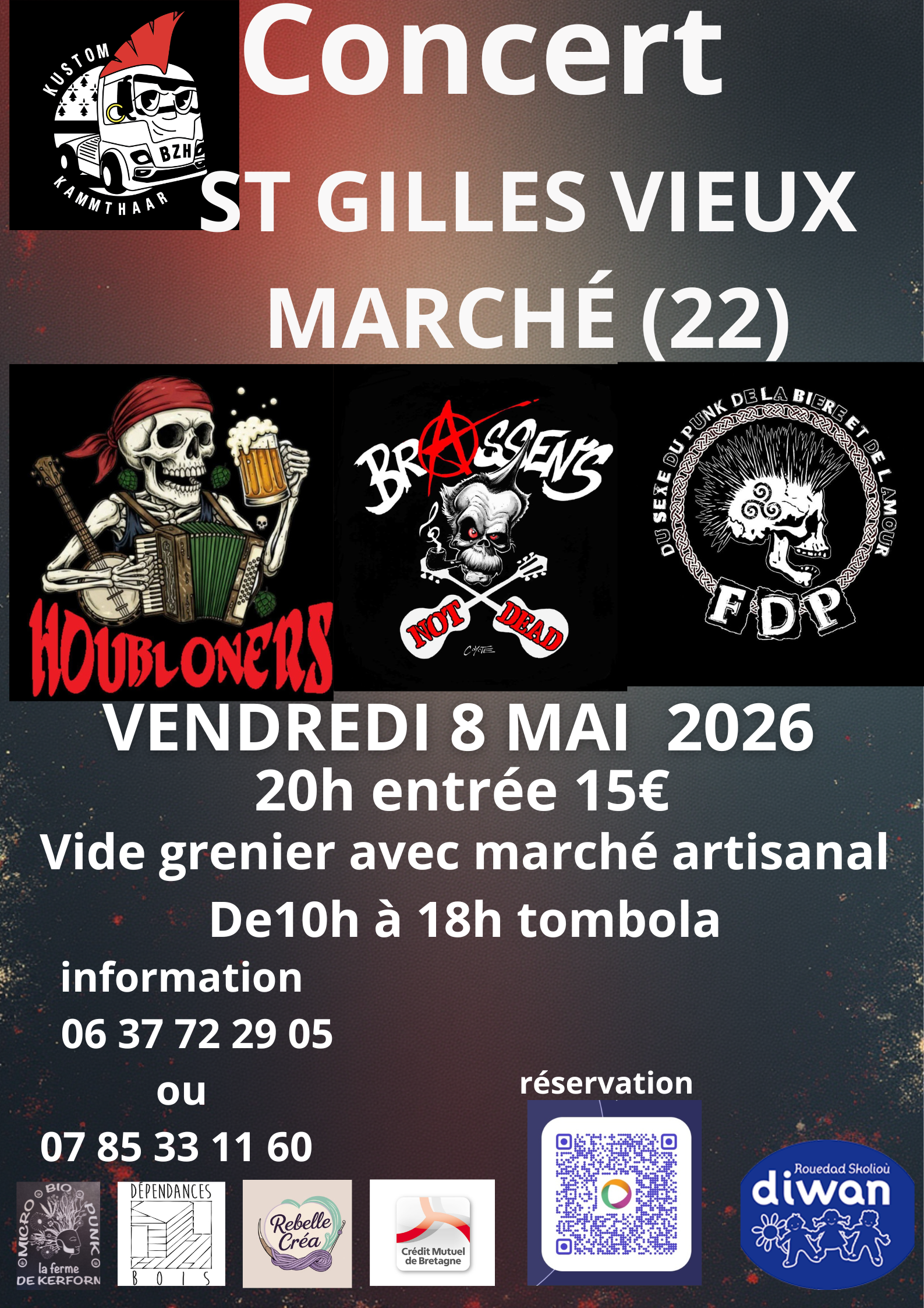 Marquez vos calendriers! Le 8 mai 2026, rejoignez-nous à St Gilles Vieux Marché (22) pour une journée riche en découvertes. Au programme: un grand marché artisanal pour dénicher des trésors locaux, un vide-grenier pour les bonnes affaires et, en soirée, des concerts exceptionnels avec les groupes Brssen's Not Dead, Houbloners et D.F.P Une ambiance garantie pour tous les âges et tous les goûts! Venez partager ce moment de convivialité avec l'Association Kustom Kammthaar BZH (22).
